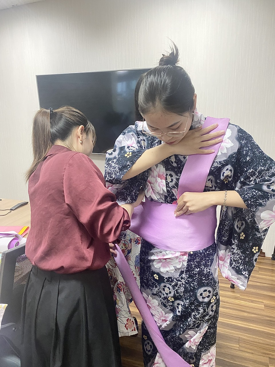 先生方は、着付けの方法から帯の結び方、小物の選び方まで丁寧にご指導くださいました。