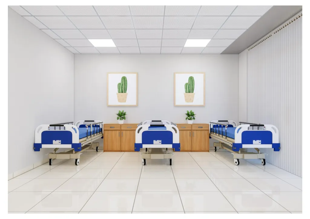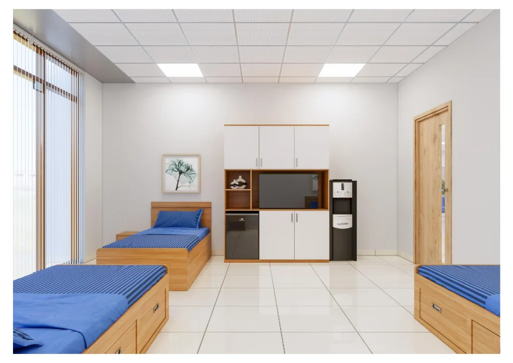 個室にはテレビ、エアコン、専用トイレ・洗面設備が整っており、安心して過ごせます。